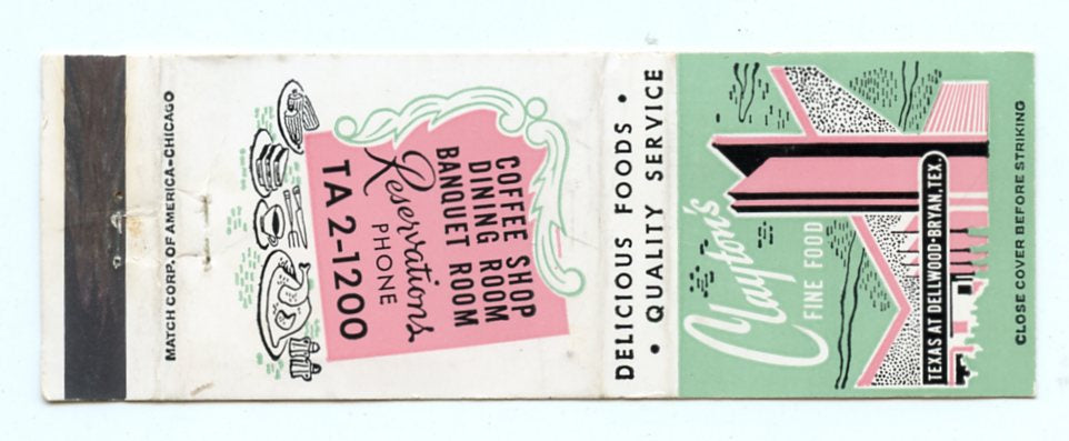 Clayton's Fine Food, Bryan, TX Matchbook Cover