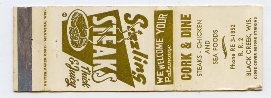 Cork & Dine, Black Creek, Appleton, WI [Matchbook Cover]