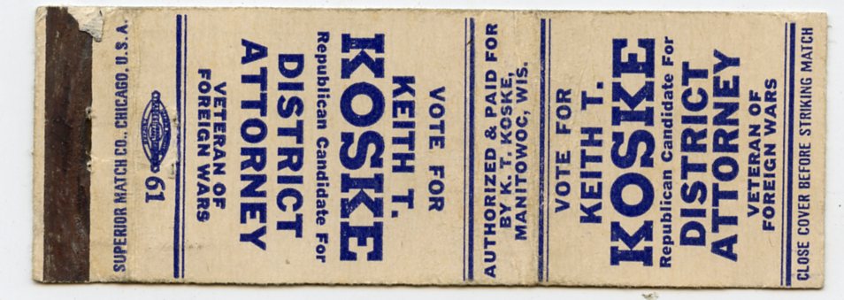 Keith T. Koske for District Attorney, Manitowoc, WI Matchbook Cover