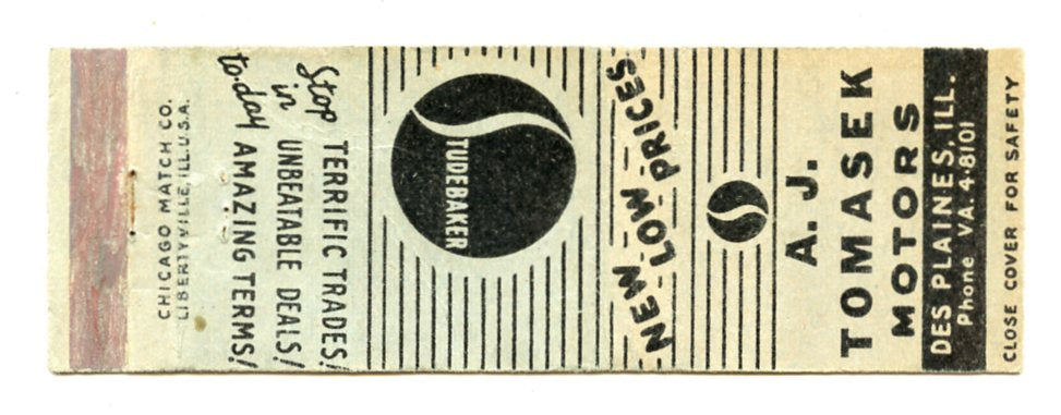 A. J. Tomasek Motors, Des Plaines, IL Matchbook Cover