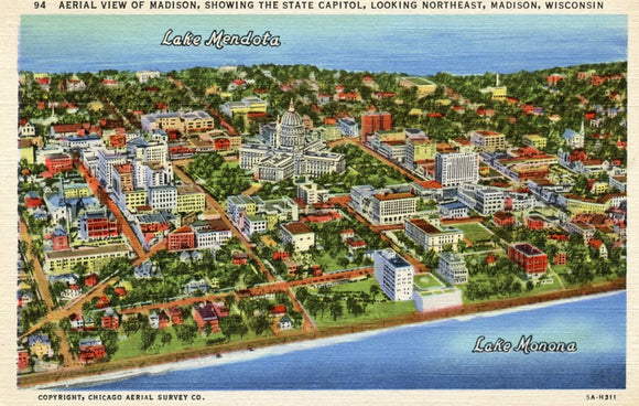 Aerial View of Madison, Showing the State Capitol, Looking Northwest, Madison, WI [Postcard]