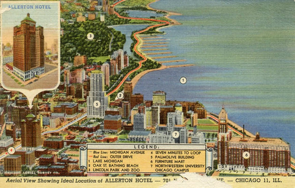 Aerial View Showing Ideal Location of Allerton Hotel, Chicago, IL [Postcard]