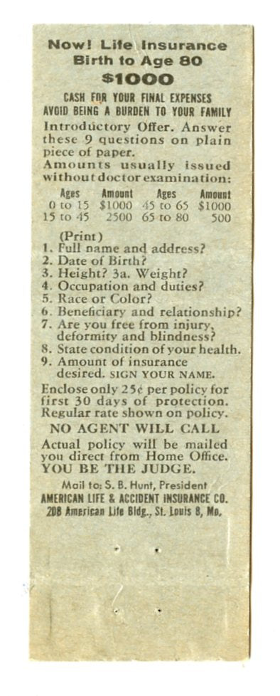 MATCHBOOK TITLE: American Life & Accident Insurance Co.