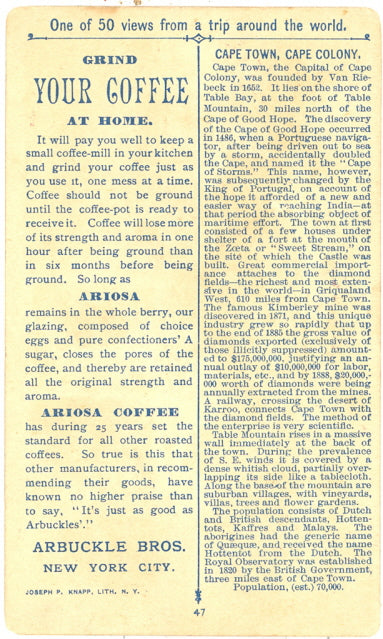 Arbuckle Bros. Coffee Co. Trade Card. One of 50 views from a trip around the world. No. 47 in the series. Cape Town, Cape Colony.