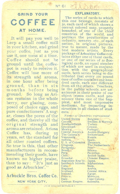 Arbuckle Bros. Coffee Co. Trade Card. This is one of a series of 50 countries of the world. No. 61 in the series. Central America.
