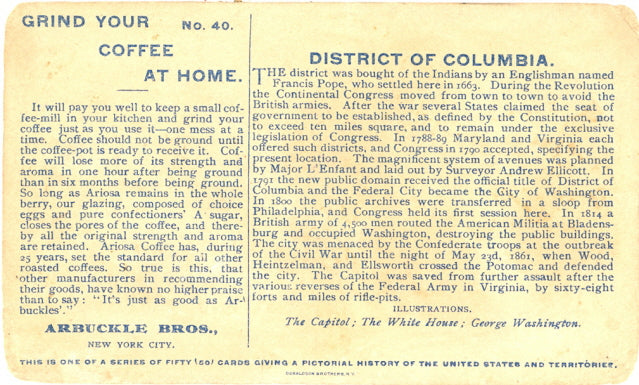 Arbuckle Bros. Coffee Co. Trade Card. This is one of a series of 50 Cards giving a pictorial history of the United States and Territories. No. 40, District of Columbia.