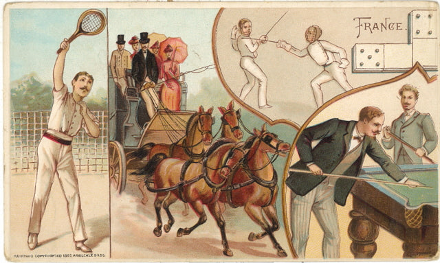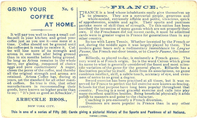 Arbuckle Bros. Coffee Co. Trade Card. This is one of a series of 50 Cards giving a pictorial History of the Sports and Pastimes of all Nations. No. 6 in the series. France.