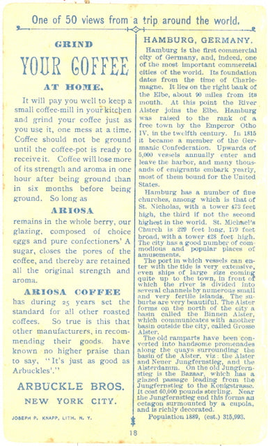 Arbuckle Bros. Coffee Co. Trade Card. One of 50 views from a trip around the world. This is No. 18: Hamburg, Germany