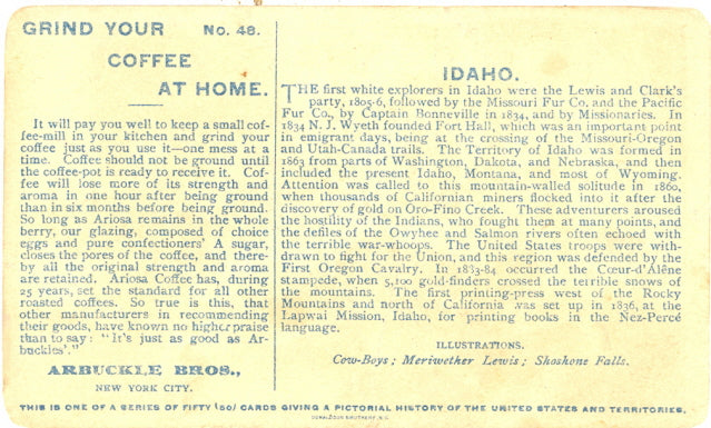 Arbuckle Bros. Coffee Co., Idaho, from the Pictorial History of the United States series, Trade Card