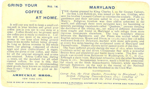 Arbuckle Bros. Coffee Co. Trade Card. This is one of a series of 50 Cards giving a pictorial history of the United States and Territories. No. 14, Maryland.