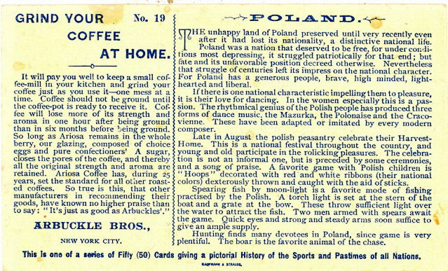 Arbuckle Bros. Coffee Co. Trade Card. This is one of a series of 50 Cards giving a pictorial History of the Sports and Pastimes of all Nations. No. 19, Poland .