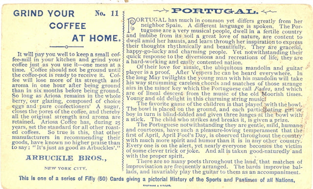 This is one of a series of 50 Cards giving a pictorial History of the Sports and Pastimes of all Nations. No. 11, Portugal.