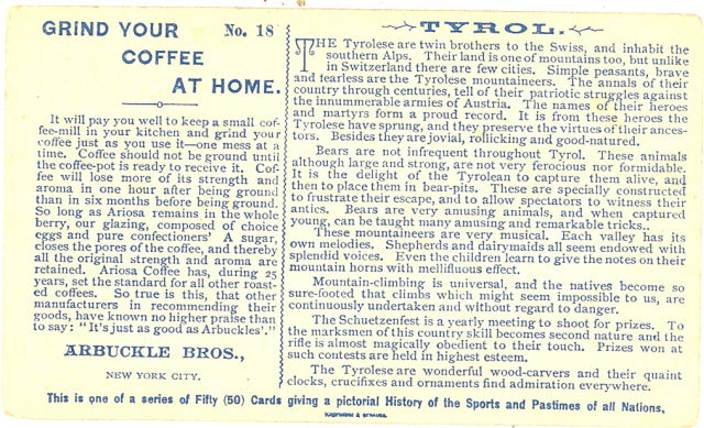 Arbuckle Bros. Coffee Co. Trade Card. This is one of a series of 50 Cards giving a pictorial History of the Sports and Pastimes of all Nations. No. 18, Tyrol.