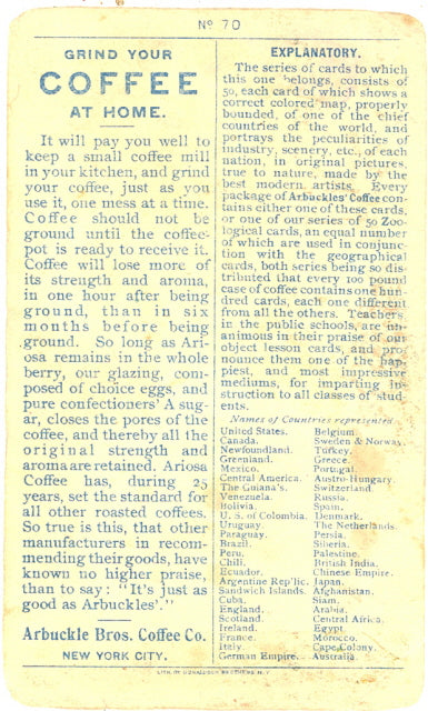 Arbuckle Bros. Coffee Co., United States of Columbia, Countries of the World, No. 70 [Trade Card]