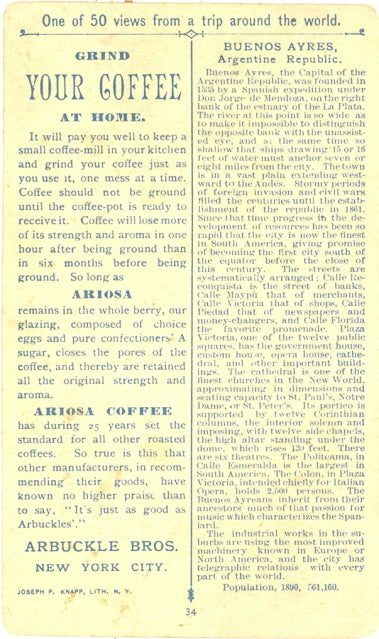 Arbuckle Bros. Coffee Co. Trade Card. This is one of a series of 50 countries of the world. No. 54 in the series. Venezuela.