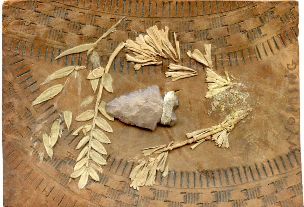 COMMENTS: Leather postcard. Very hard and stiff. Has leaves glued to the card, and an Indian "arrowhead" is attached.
