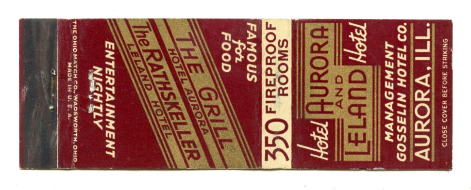 Aurora and Leland Hotels, Aurora, IL [Matchbook Cover]