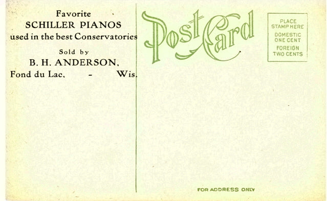 COMMENTS: Advertising postcard for "Favorite Schiller Pianos used in the best "Conservatories, Sold by B. H. Anderson, Fond du Lac. -- Wis."