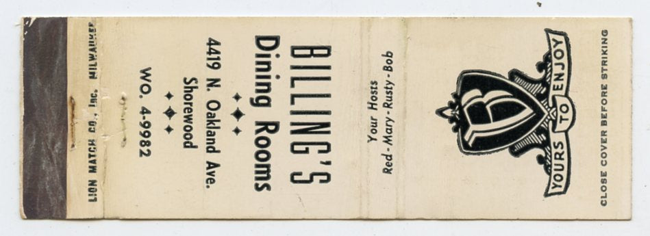 Billing's Dining Rooms, Shorewood, Milwaukee, WI [Matchbook Cover]