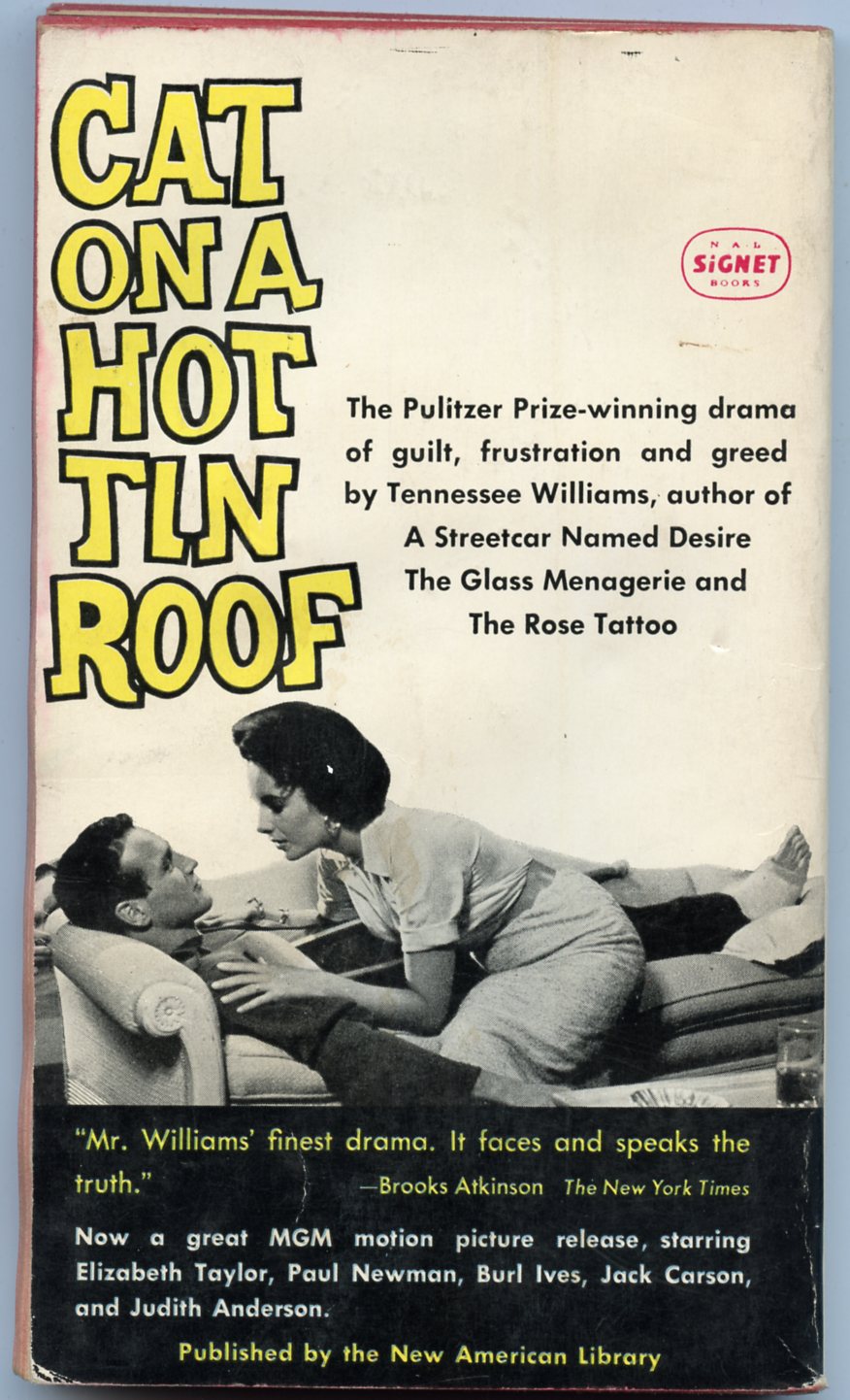 Cat On a Hot Tin Roof, by Tennessee Williams, Signet Books S1590, September, 1958, First Printing.