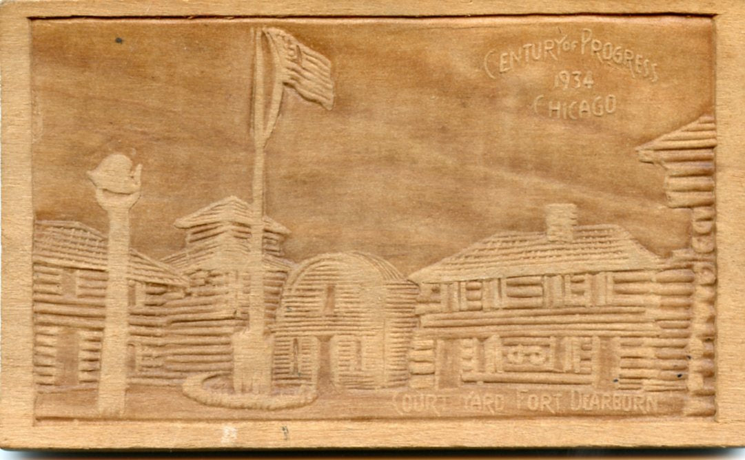POSTCARD TITLE: Court Yard Fort Dearborn, Century of Progress 1934 Chicago Wooden Postcard
