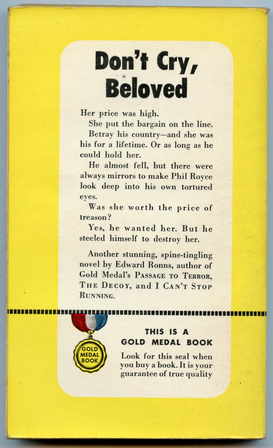 Don't Cry, Beloved by Edward Ronns. Gold Medal Book 239. First printing, May, 1952.