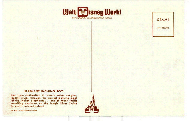 POSTCARD TITLE: Elephant Bathing Pool at Disney World. Far from civilization in remote Asian Jungles, guests cruise through the sacred bathing pool of the Indian elephants...one of many thrills awaiting explorers on the Jungle Cruise in exotic Adventureland.