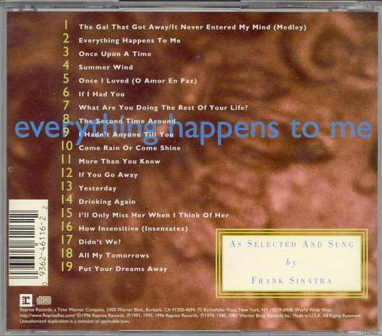 Details Contributing artists: Antonio Carlos Jobim, Laurindo Almeida Producer: Gregg Geller (Compilation) Distributor: WEA (Distributor) Recording type: Studio Recording mode: Stereo SPAR Code: n/a Album notes Personnel includes: Frank Sinatra (vocals); Laurindo Almeida (guitar); Antonio Carlos Jobim. Recorded in London, England and Hollywood and Los Angeles, California between December 21, 1960 and April 8, 1981. Includes liner notes by Frank Sinatra, Tina Sinatra and Paul Clemens. In 1995, looking back on his recorded canon, Sinatra, who's always been smart enough to play to his strengths, identified the regretful, melancholy strain of his repertoire as one of the most consistent and rewarding artistic threads. He was, after all, the quintessential "saloon singer," the guy chewing the bartender's ear off ever so eloquently about his broken dreams. With the wisdom age brings, Sinatra began to appreciate these songs even more in the later years of his life, and decided to grace his fans with this handpicked compilation, representing the darkest nights of the singer's musical soul. Appropriately, EVERYTHING HAPPENS TO ME includes its fair share of latter-day recordings, like "The Gal That Got Away" and the despairing title tune, where Sinatra's angst is informed by a lifetime of experience. His memory is too good to neglect his glorious 1960's gloomfests, though; "Once Upon A Time" and "Put Your Dreams Away" are prime mid-period examples of Sinatra's way with a weeper. Along the way, he employs the lyrics of everyone from Jimmy Webb to Paul McCartney in the interest of expressing the pain that lies hidden in the collective heart of the world as we know it.
