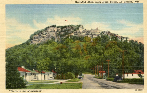 POSTCARD TITLE: Grandad Bluff, from Main Street, La Crosse, Wis. "Bluffs of the Mississippi"