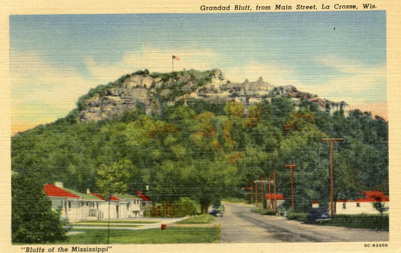 POSTCARD TITLE:   Grandad Bluff, from Main Street, La Crosse, Wis. "Bluffs of the Mississippi"
