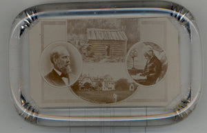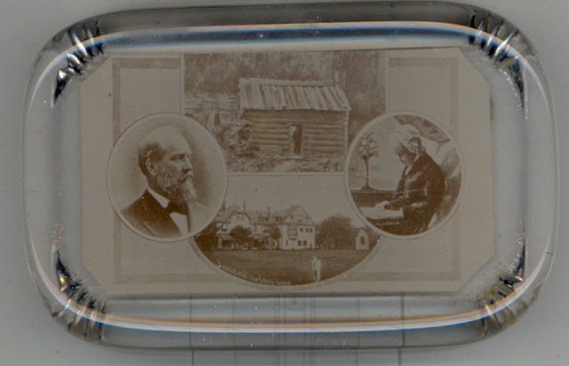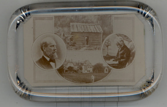 Four pictures: James A. Garfield; Grandma Garfield; The log cabin in which Garfield was born; and the family home at Mentor, Ohio.