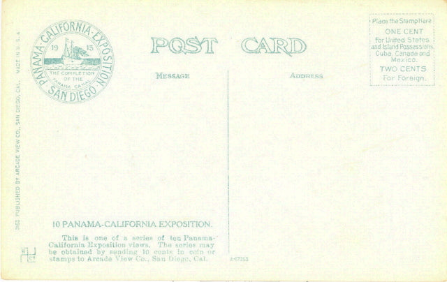 This one of a series of 10 Panama-California Exposition views. The series may be obtained by sending 10 cents in coin or stamps to Arcade View Co., San Diego, Cal.