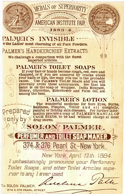 Solon Palmer, Perfumers & Toilet Soap Maker, 374 & 376 Pearl St., New York