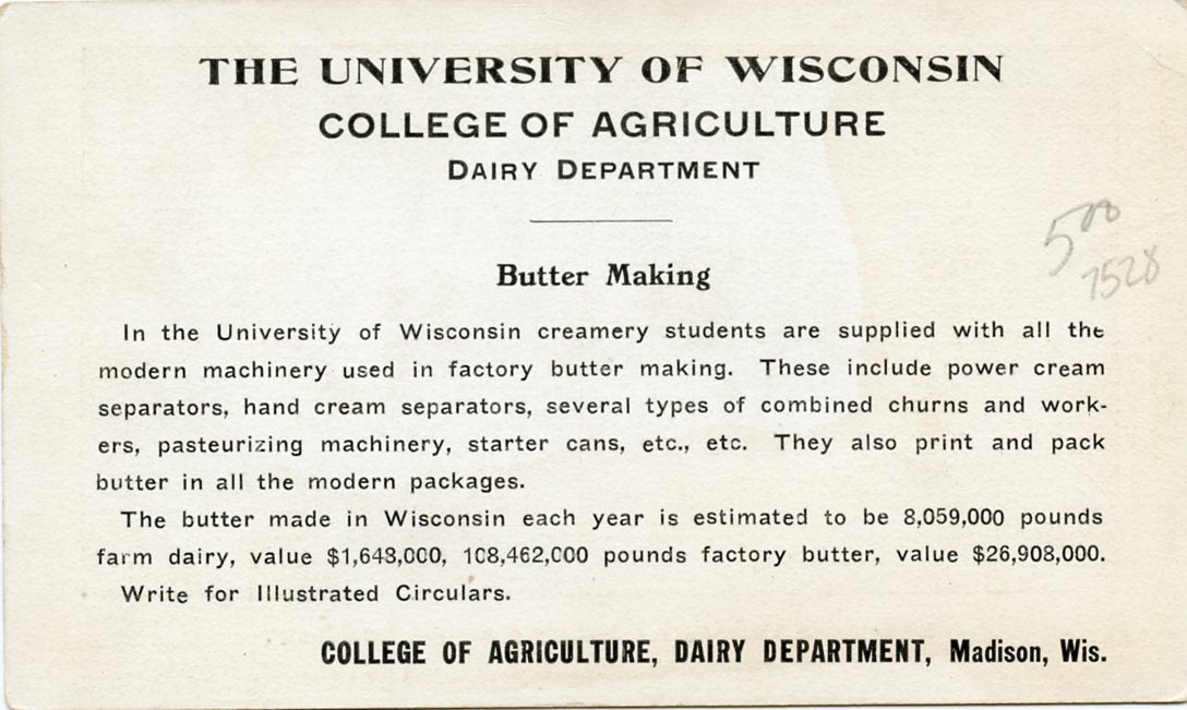 POSTCARD TITLE: Students in University Creamery Operating Machinery, College of Agriculture, Dairy Department, Madison, Wis.