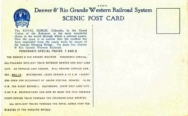 POSTCARD TITLE: The Royal Gorge, Colorado. On Main Line, Denver and Rio Grande Western Railroad