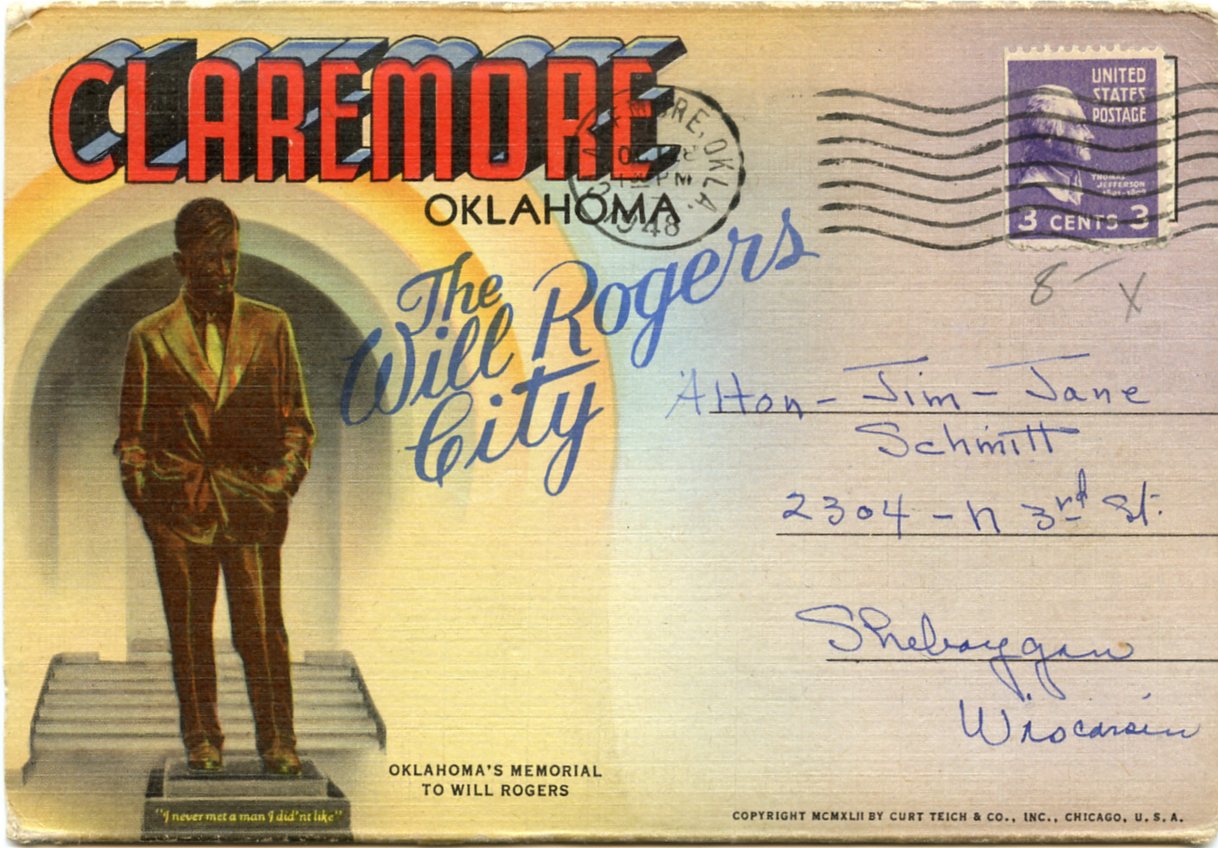 POSTCARD TITLE: The Will Rogers City, Claremore, Oklahoma