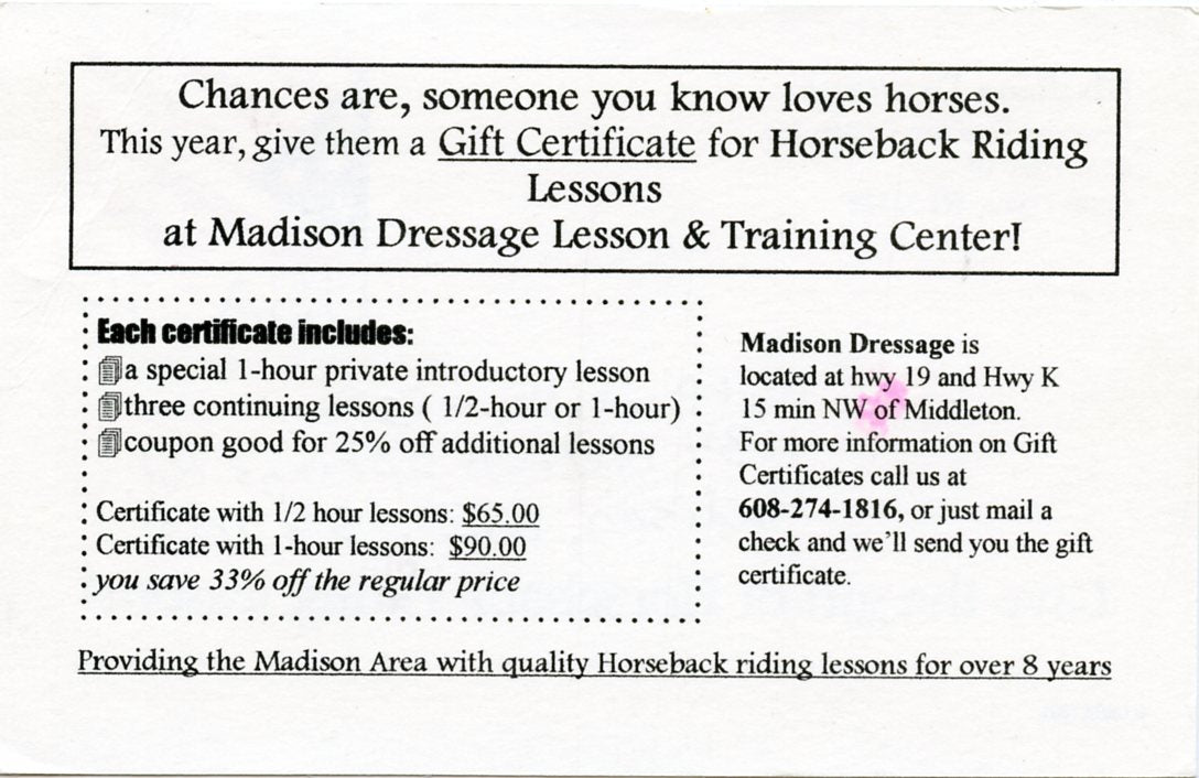 U. S. Postal Card, Nineteen Cents, Madison Dressage, Cross Plains, WI [Postcard]