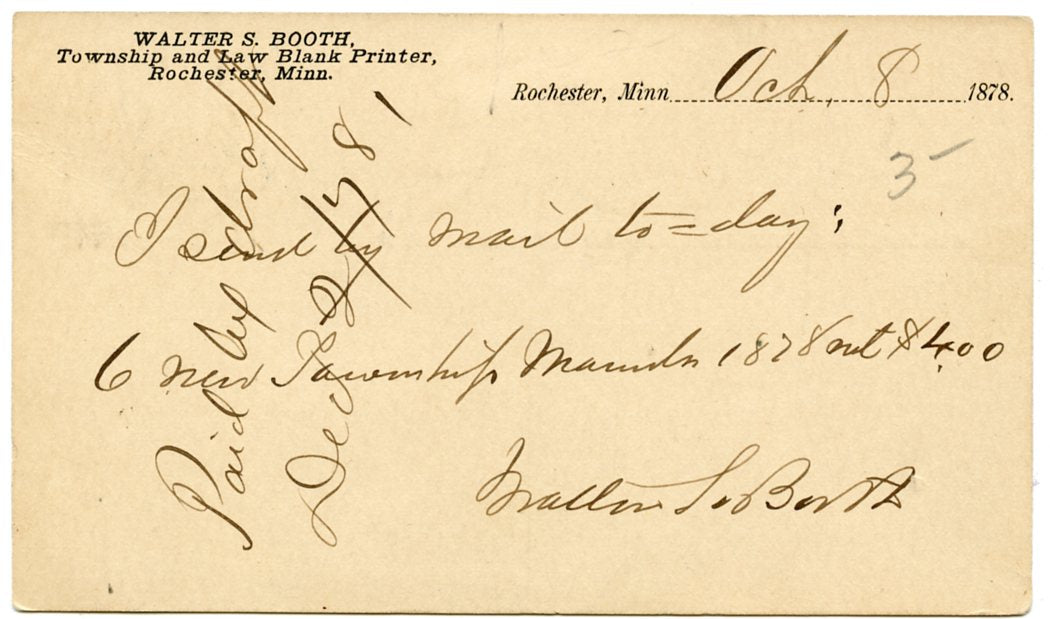 U. S. Postal Card, One Cent, 1878, Walter S. Booth, Rochester, MN [Postcard]