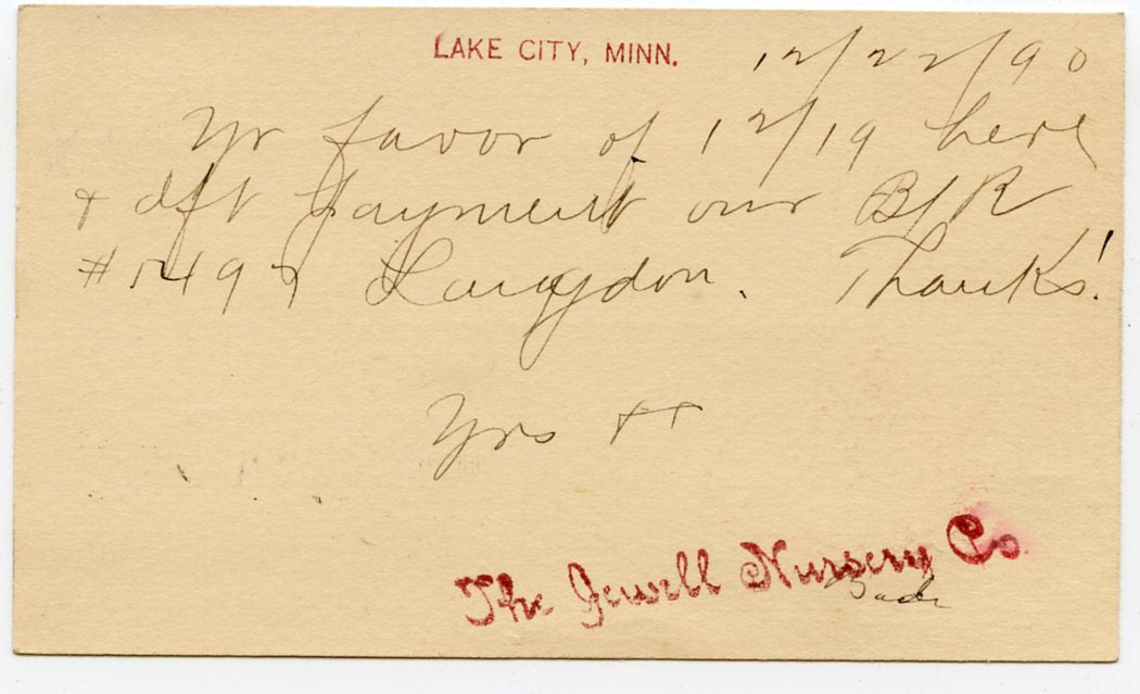U. S. Postal Card, One Cent, 1890, The Jewell Nursery Co., Lake City, MN [Postcard]