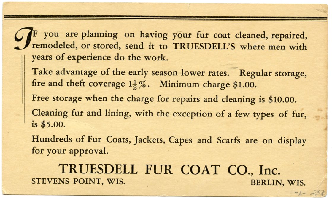 U. S. Postal Card, One Cent, 1934, Truesdell Fur Coat Co., Berlin, WI [Postcard]