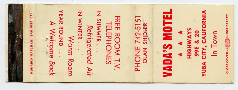 Vada's Motel, Yuba City, CA [Matchbook Cover]