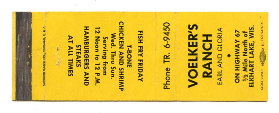 Voelker's Ranch Restaurant, Plymouth, WI [Matchbook Cover]