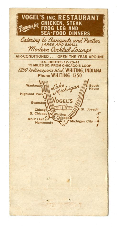 Vogel's Restaurant, Whiting, IN Matchbook Cover