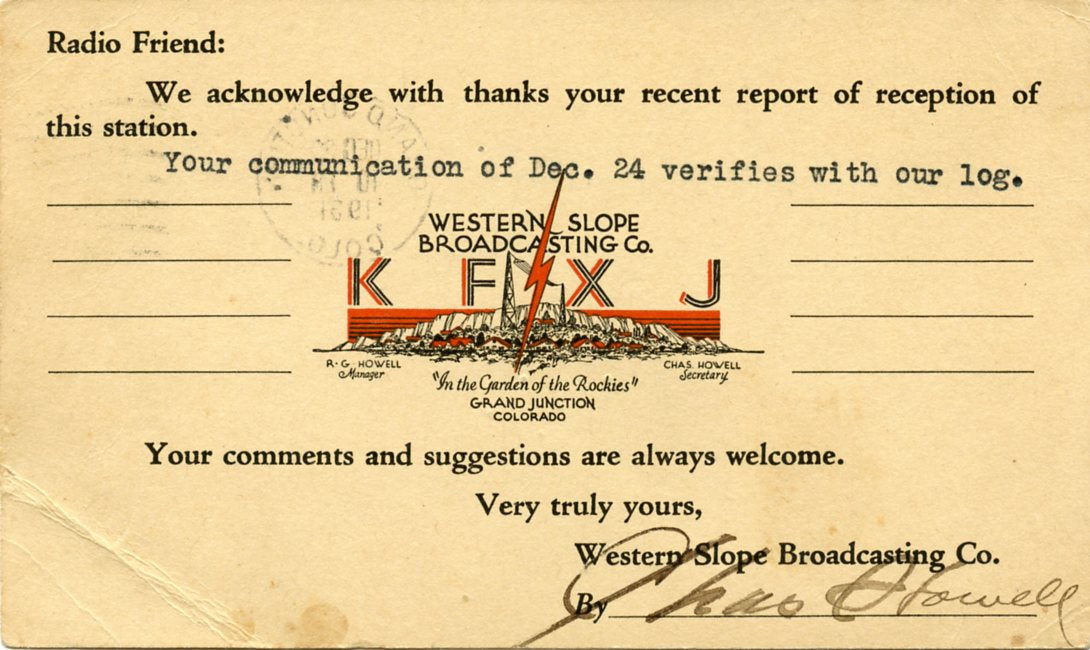 Western Slope Broadcasting Co., KFXJ, Grand Junction, CO [Postcard]