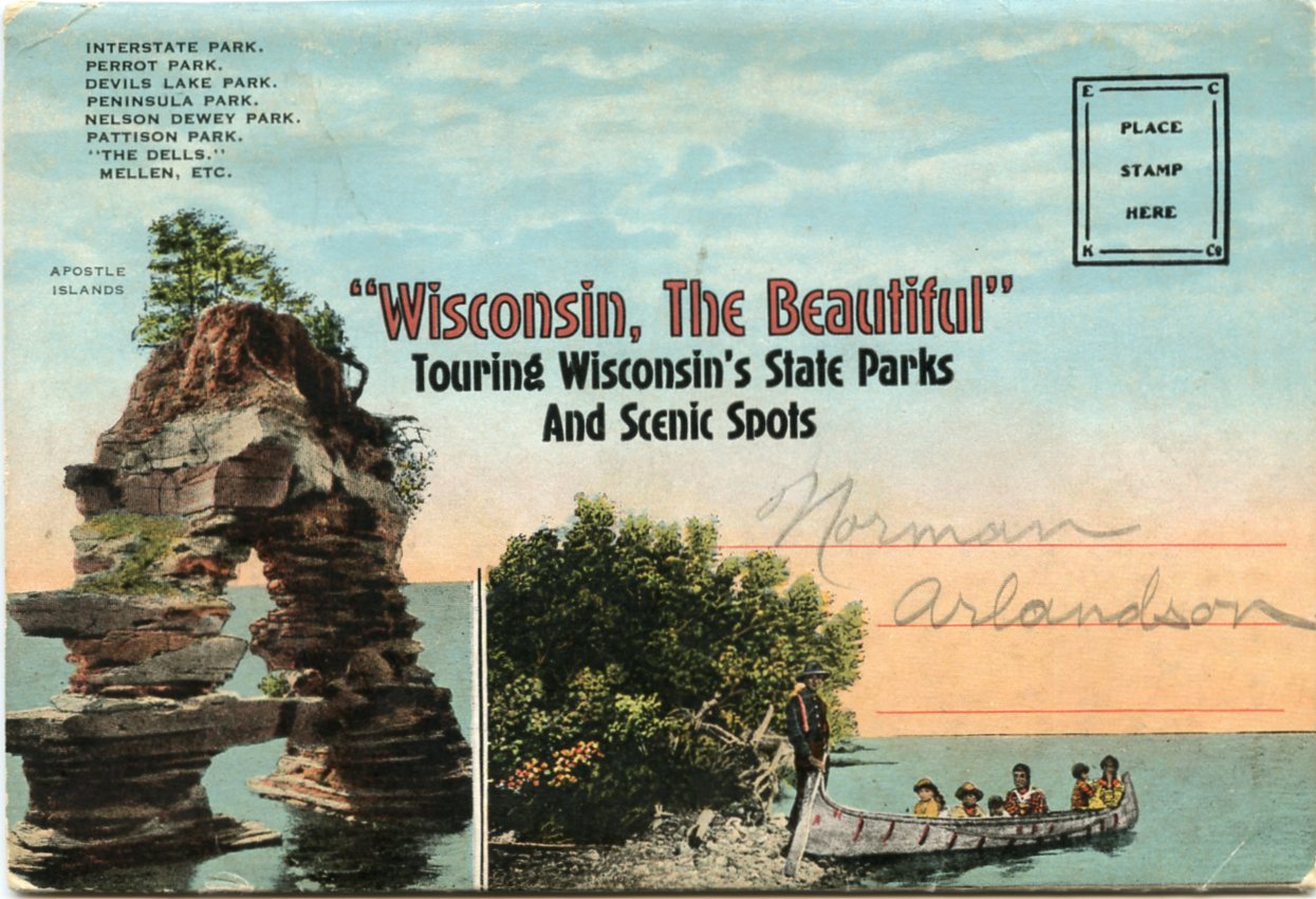 POSTCARD TITLE: "Wisconsin, The Beautiful," Touring Wisconsin's State Parks and Scenic Spots